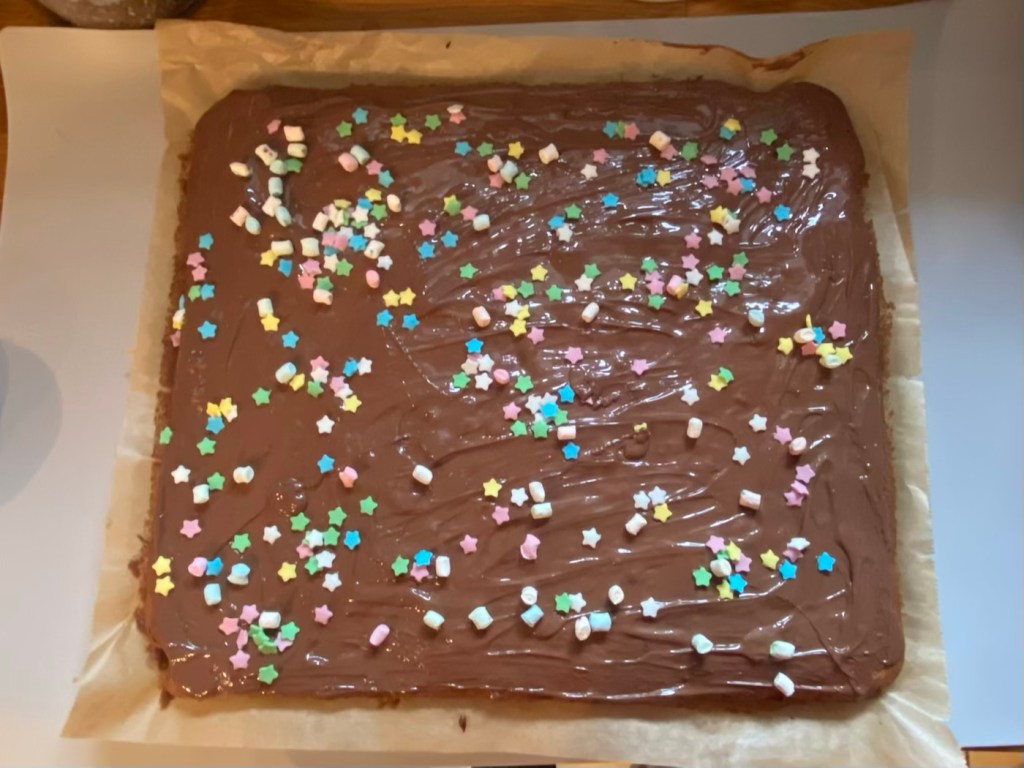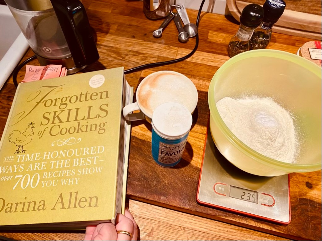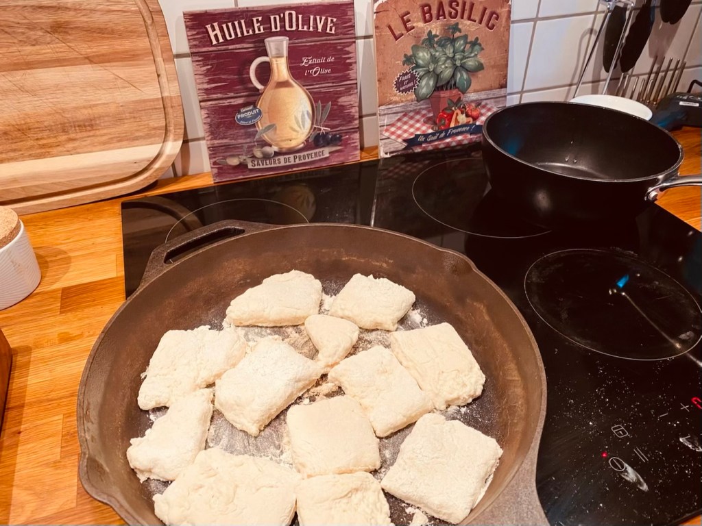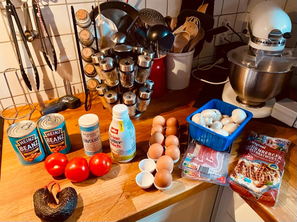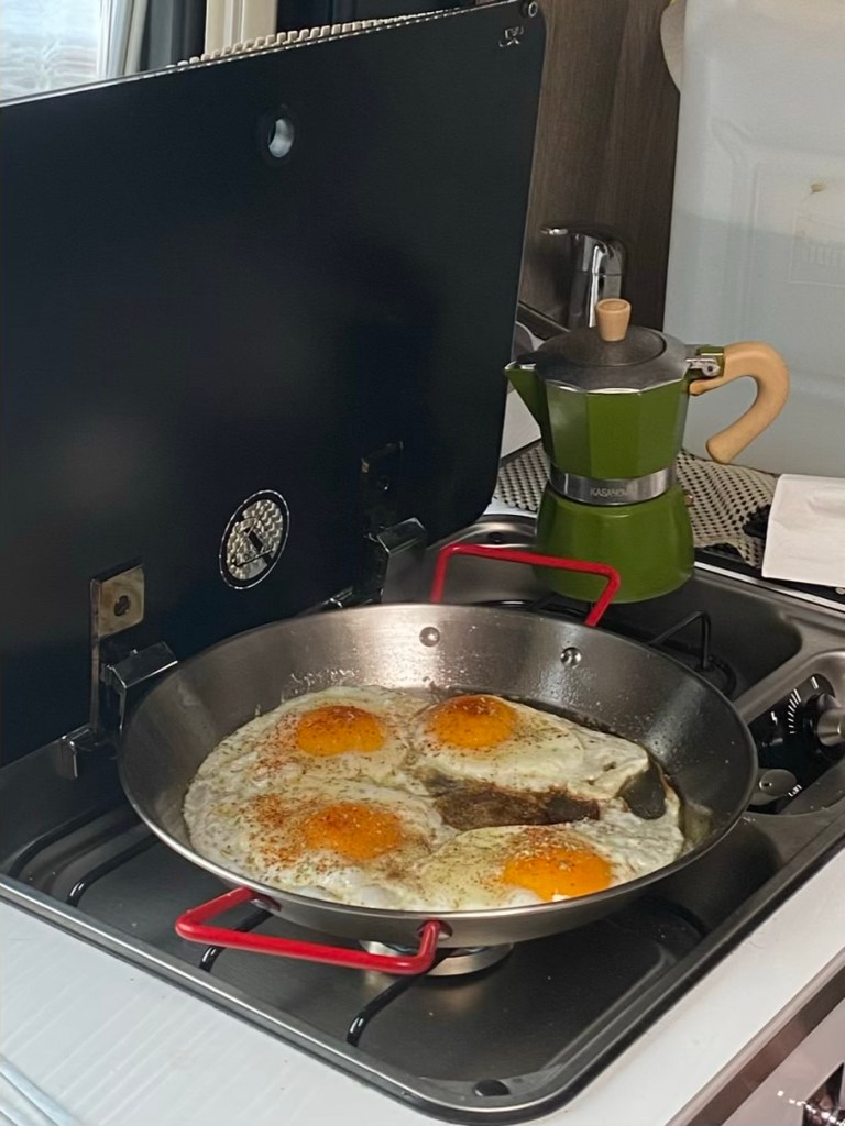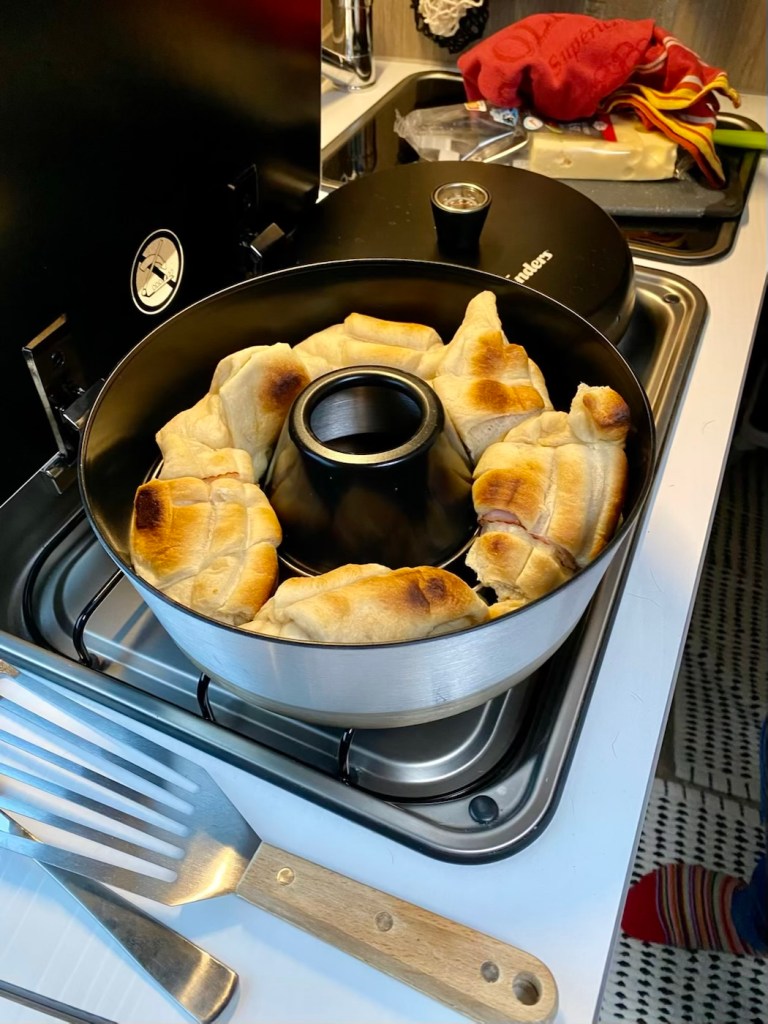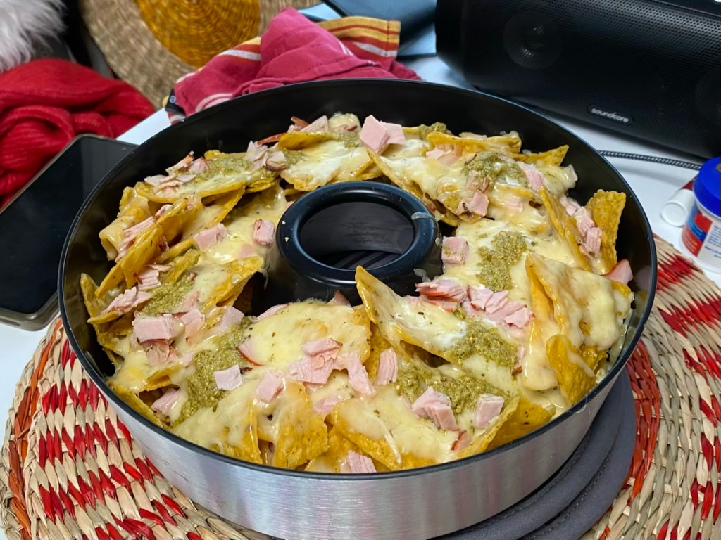 Dinner time means trying out new recipes in van kitchen equipment: nachos with ham, cheese and pesto.