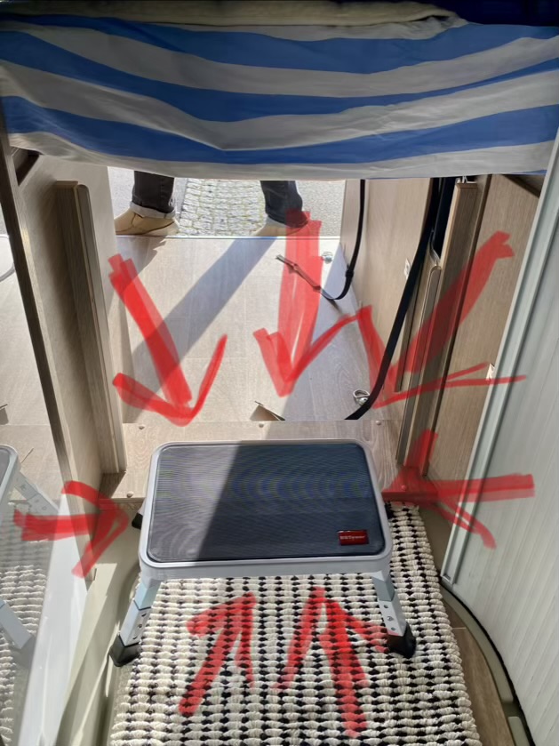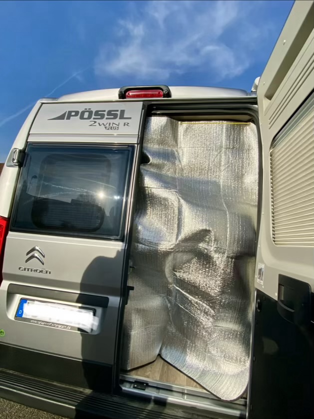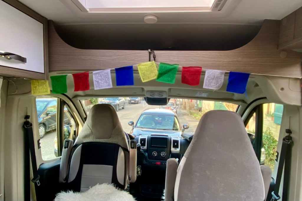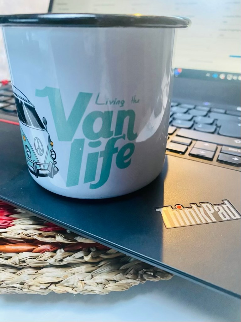 Working from the van worked surprisingly nice, hubby could just lower his voice a little in his meetings. lol. The reason why we chose the van including a bathroom paid already off —> can be used as wall separation inside the van, comes in very handy 🙂