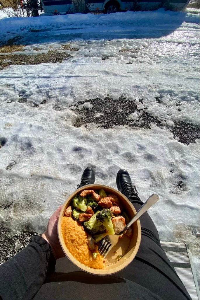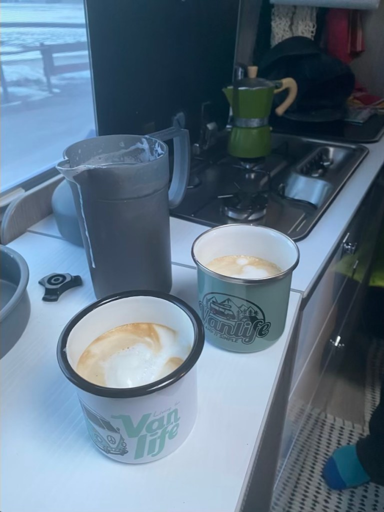 We took our van to a winter wonderland, and kind of chose hard core for our maiden voyage: snow, temperatures below zero (up to -9C degrees at night), and working from the van… (spoiler: it all worked out great, except the dog having panic attacks and me a bit too close to the ice on the road…).