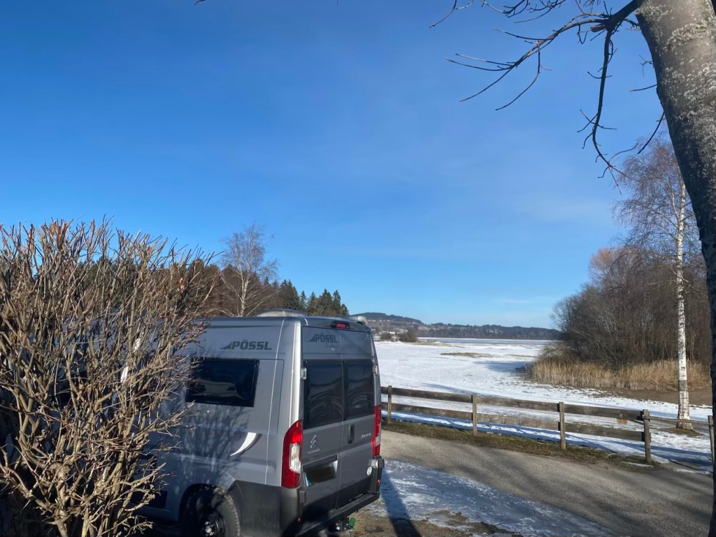 We chose this place for its beauty (next to a beautiful frozen lake), its internet (for mobile working), electricity (being warm) and it’s close distance to the Austrian border.