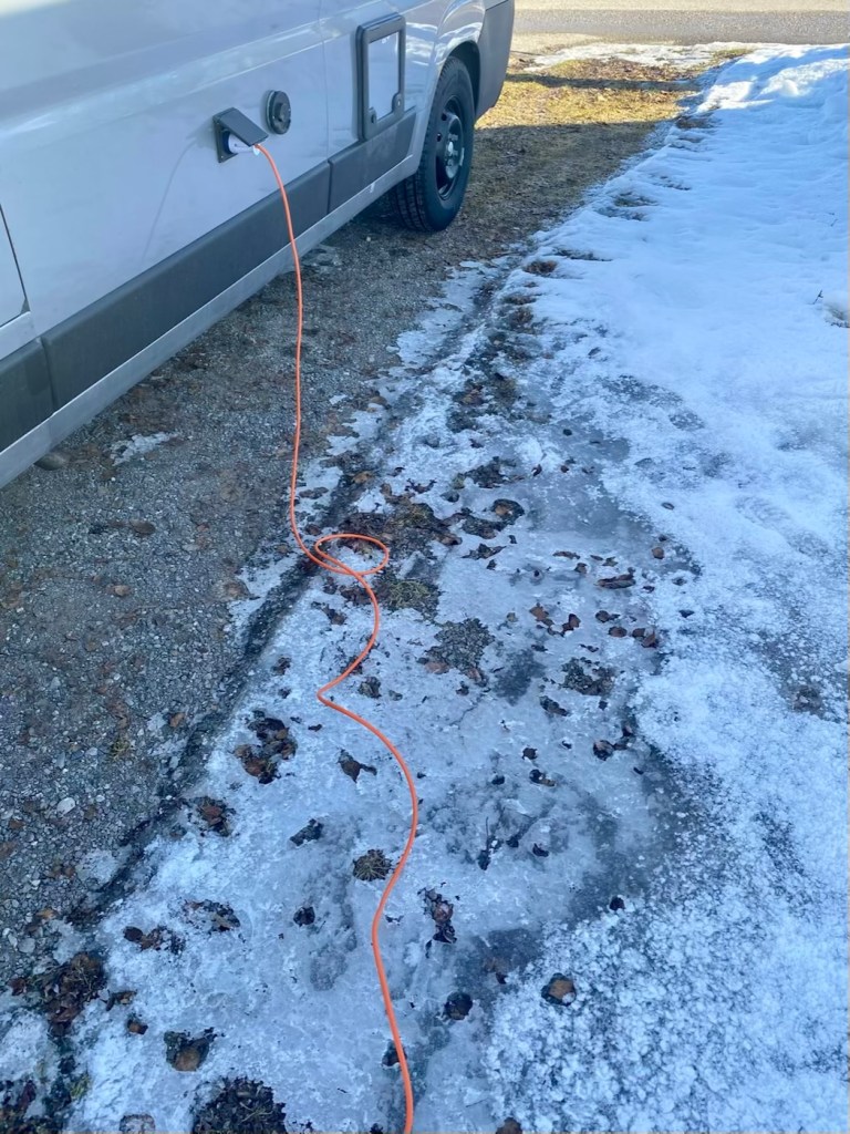 To prevent freezing in tanks or pipes, we decided to not use the waste water tank, especially since infrastructure was around. The down side… you have to get fully dressed (boots, coat, etc.) for walking to the bathroom, dog walk, or anything else.