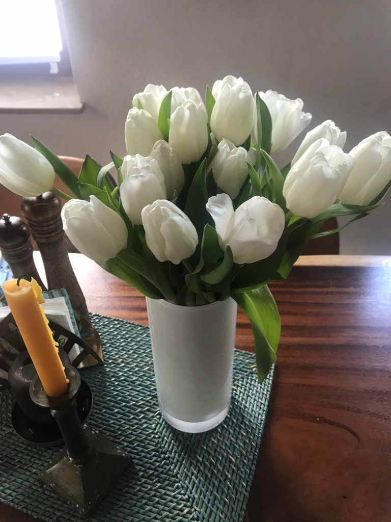 It’s January. The birds are back and beautifully singing. The sun is shining. The sky is blue. It’s too warm for winter coats. And there is tulips on my table (next to the honey wax winter candle).