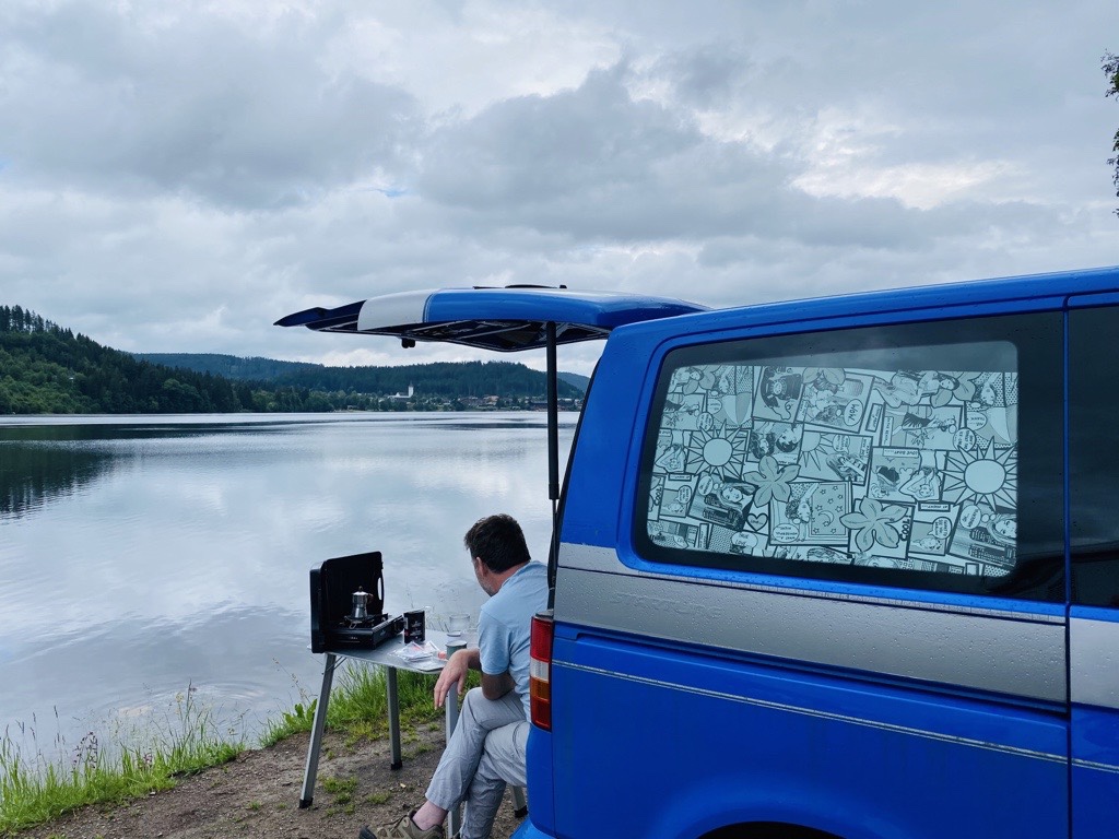 Second night. This time at a camping place (testing what we like or dislike). The lake just two steps in front of us. Beautiful!