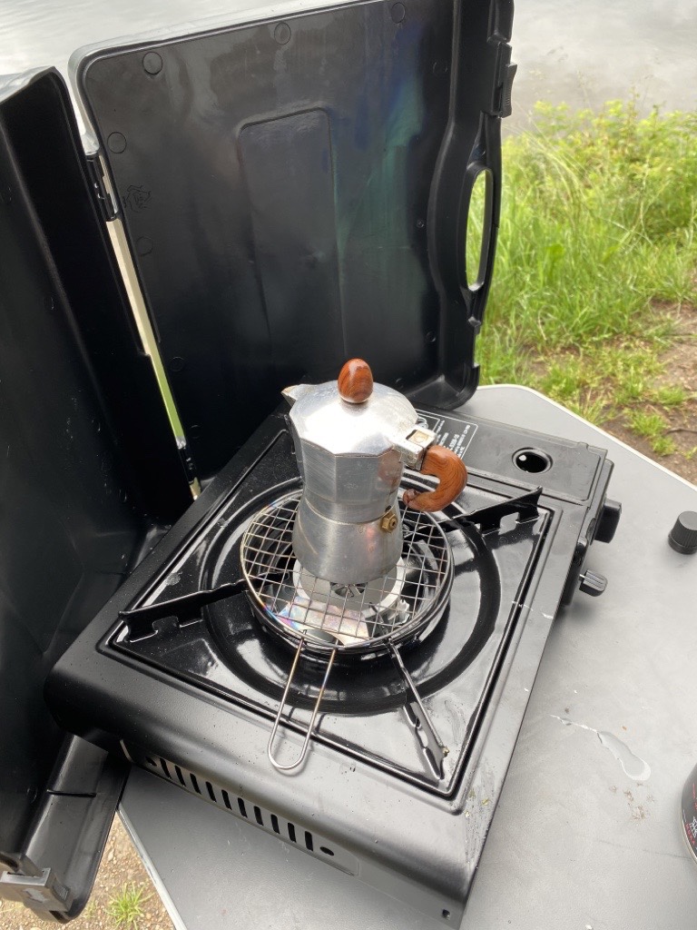 Hubby’s favorite part: making espresso with a fire lit by pine cones.