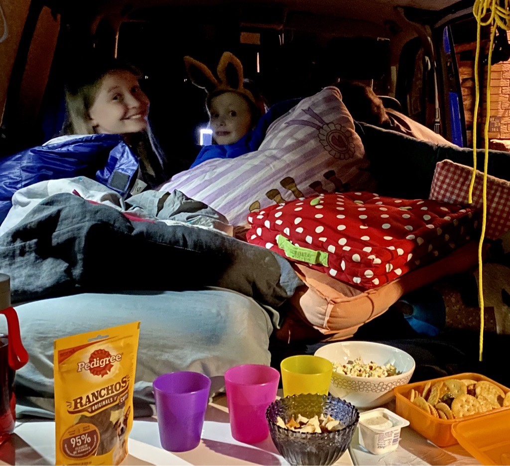 Girl’s night: Autokino in our camper van. Popcorn included. Charlie also. Fun nights!