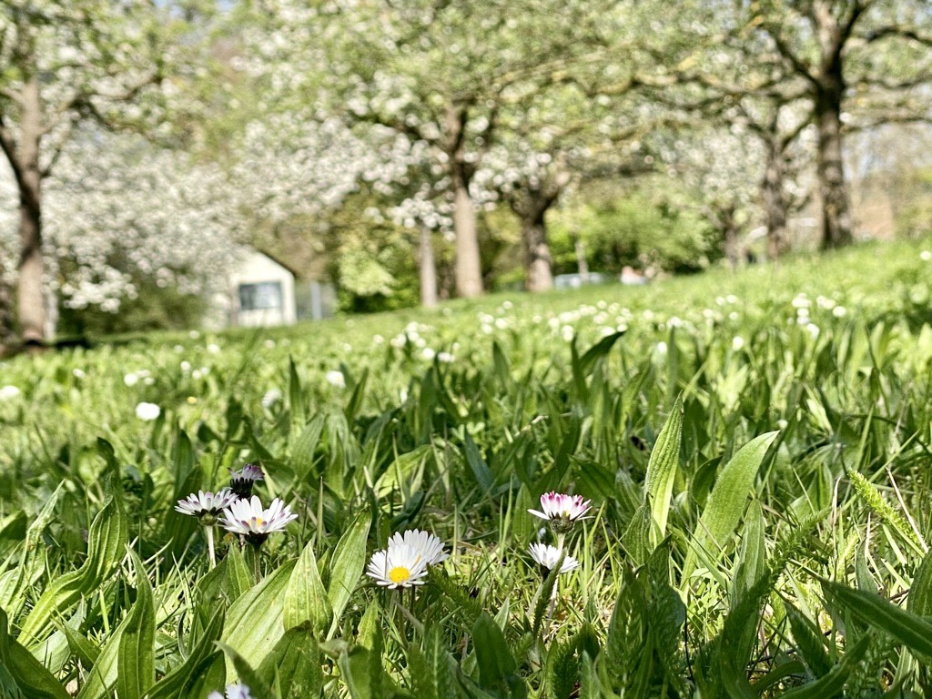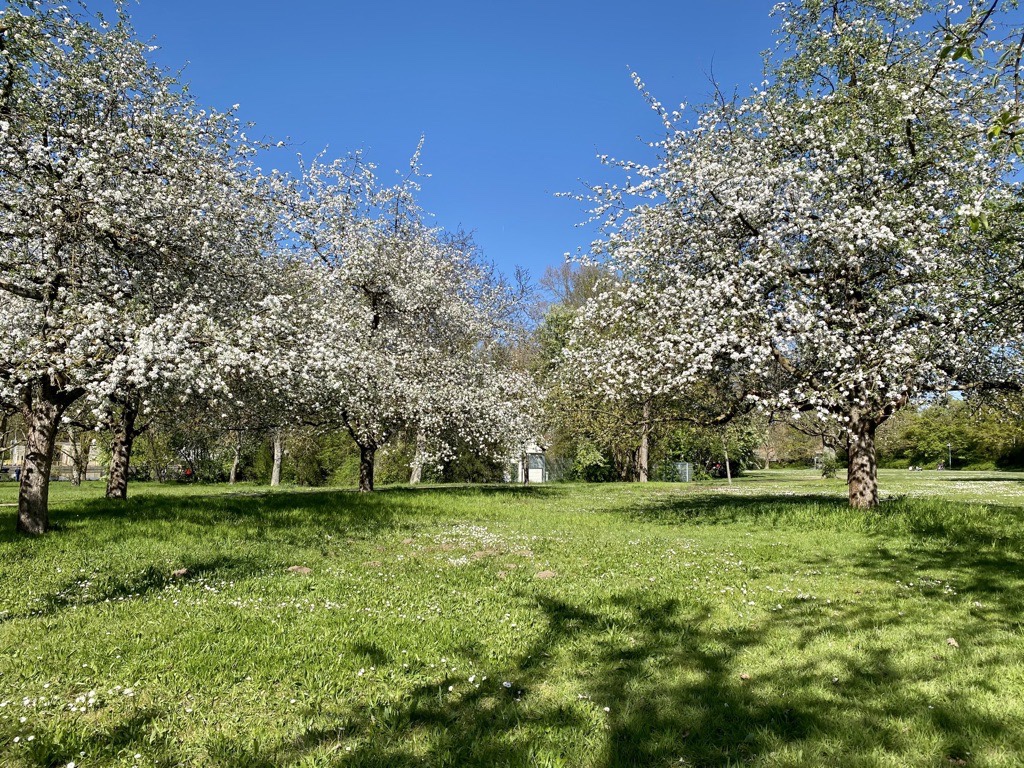 Chilling in the shade of apple trees.