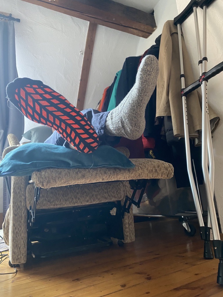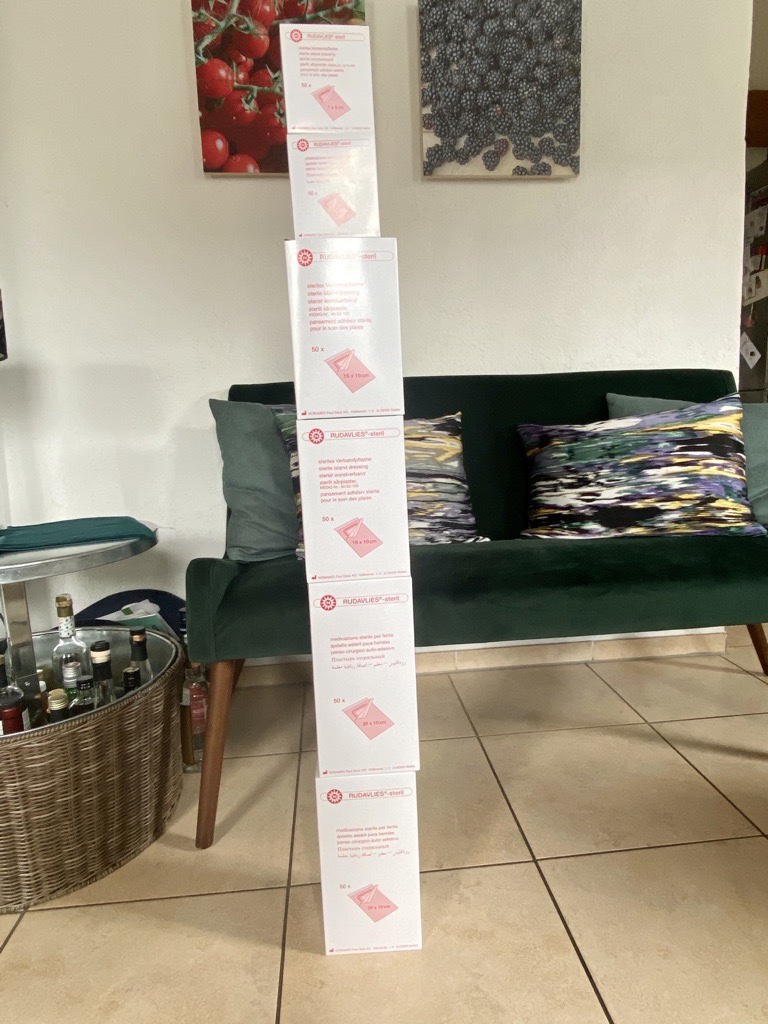 A new experience: wheel chairs and learning that taking medicine on time is essential (otherwise dying of pain). Daily thrombosis injections („I think you paralyzed my leg now“ – hubby’s comment if the content did land on the floor instead of inside him. Oh and we changed to only stomach now… Lol). Wound and bandage check & change. Both – injections and bandage change – the biggest challenge for me (who never wanted to be a nurse).