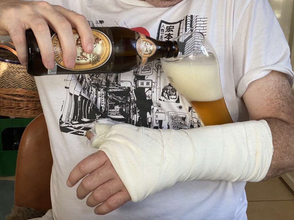 Stitches are out. Only one bandage left. Showers are allowed again (and must feel so refreshing, perfect timing). He survived 4 weeks with nurse Anny so far. Yeah & time for more Aperol (for me) tonight! PS: I’m a real pro now giving thrombosis injection.