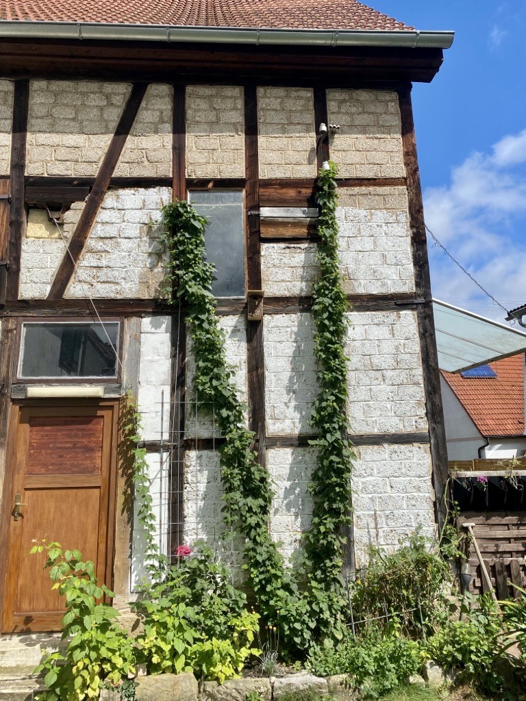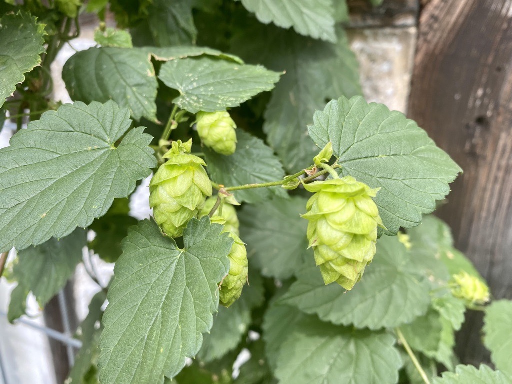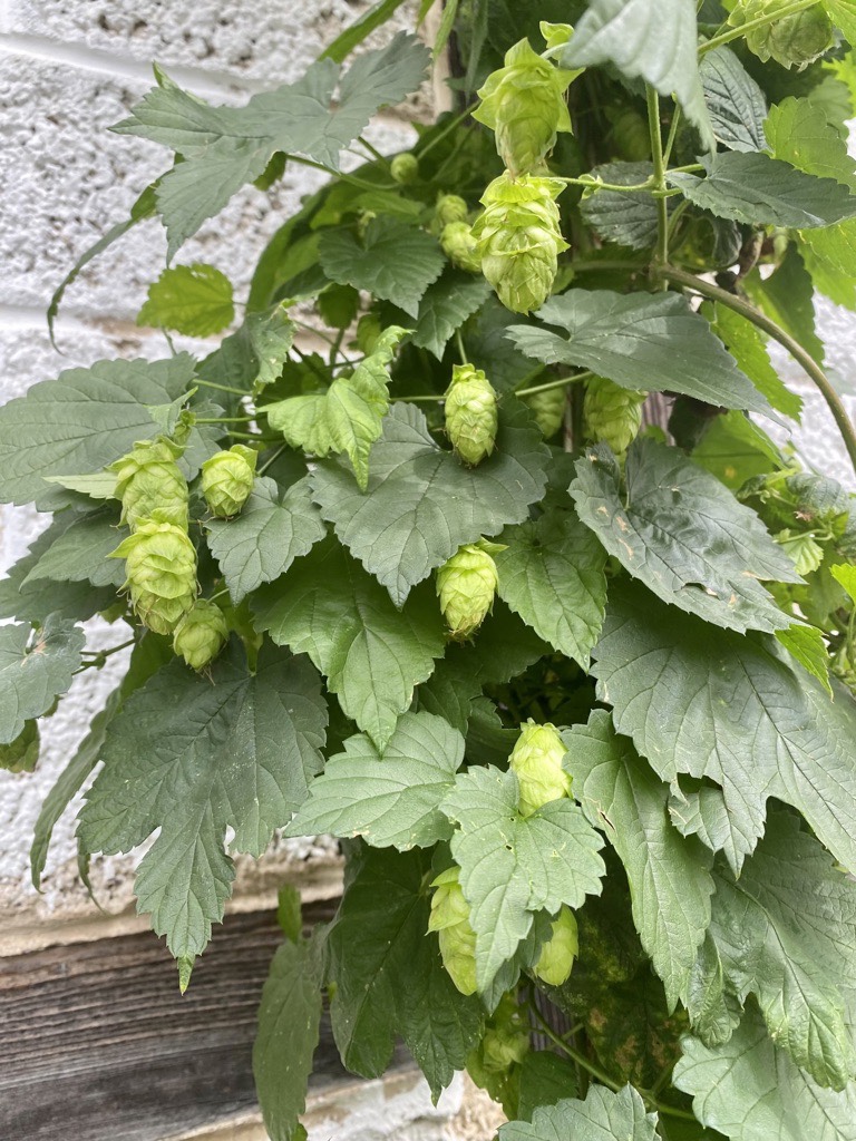 Next step: harvesting. But when are hops ready to harvest? …when they make a crunching sound if rolled up to your ear… well, I leave this up to hubby.