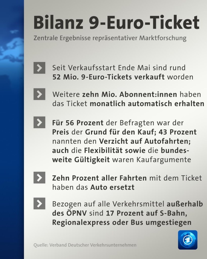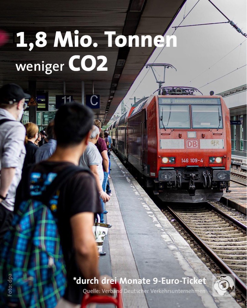 The German 9€ public transportation ticket – a success story: 52 million 9€ tickets were sold in the past 3 months (leading to a saving of around 1,8 million barrel of CO2). Wow! And the best part: I was part of it (8 bus & 2 metro rides rather taking the car). Yeah!