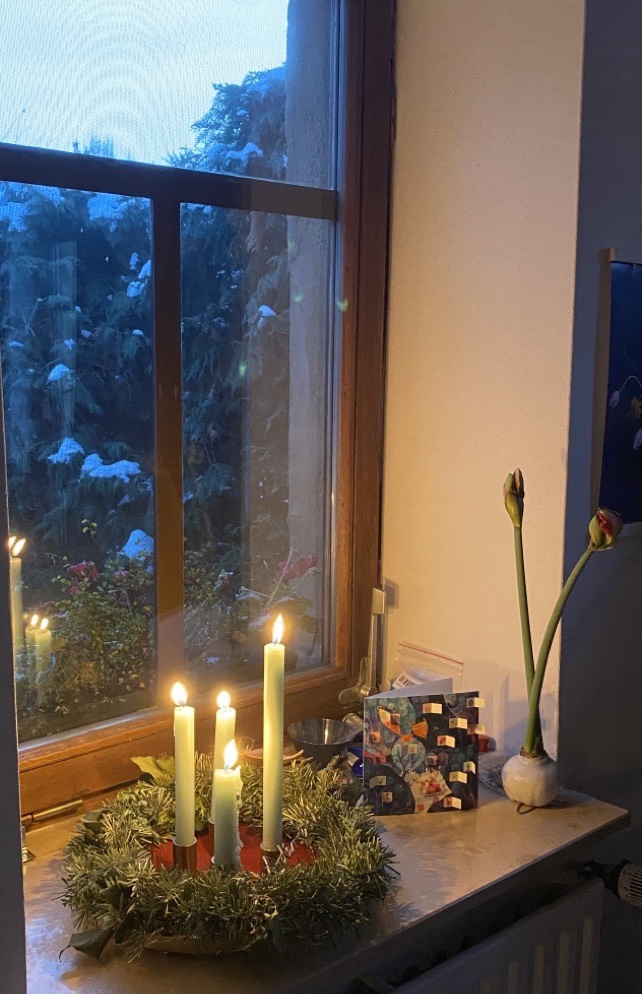 Today all four candles on the Adventskranz are burning, each with its own meaning… The candle of Hope, the candle of Love, the candle of Joy, and today the fourth, the Peace Candle.