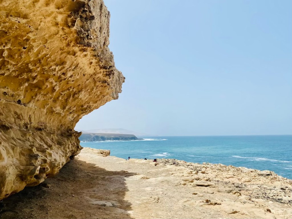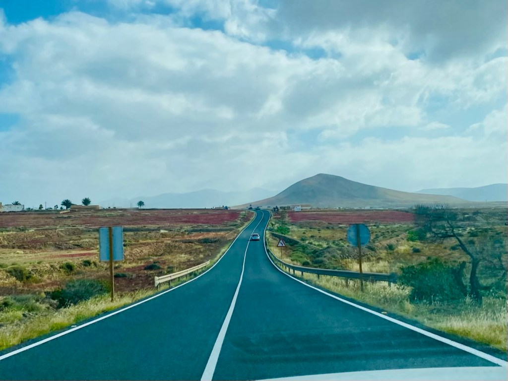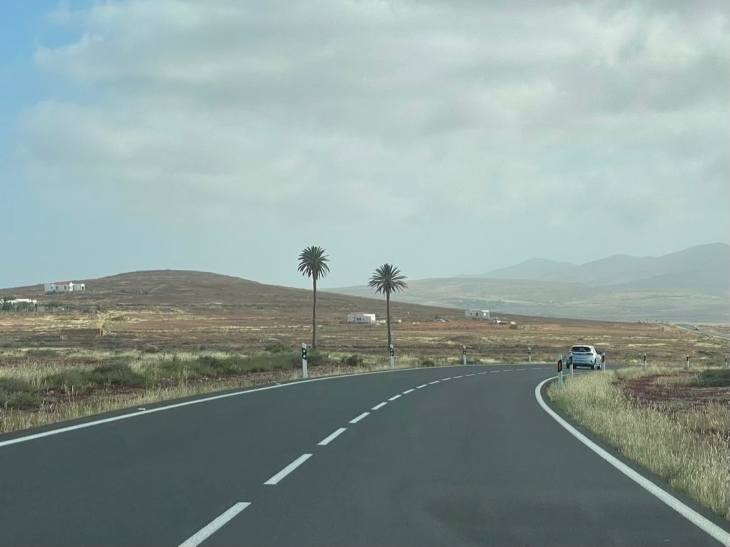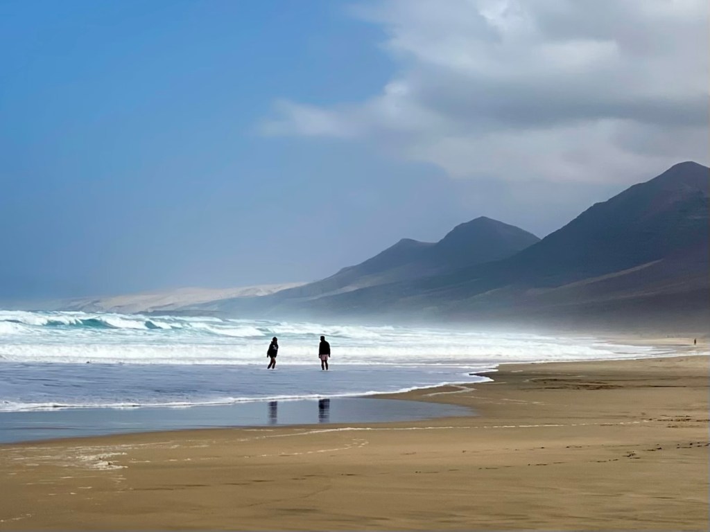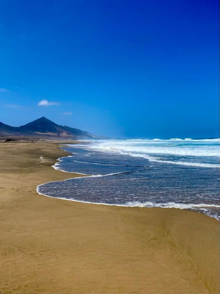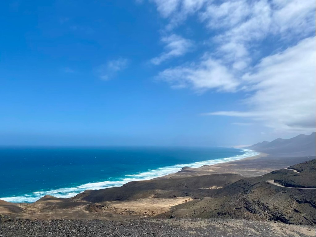 Coffee break at the beach. Heavenly.Let’s go Cofete 🌊 Unpaved dramatic road for 19 kilometers (let’s see what the rental car company thinks of this… but it was worth it). Sometimes not enough space for 2 cars passing by… no risk, no fun ✌🏻The car as dirty as us, and we didn’t end up in the sea, a very successful day! Wow! That view! Hard to focus on driving… it was that windy, we couldn’t even open the car doors 😳Arrived. Loved watching the crashing waves 🌊 A wild, isolated 12-kilometer stretch of sand backed by the dramatic Jandia mountains.