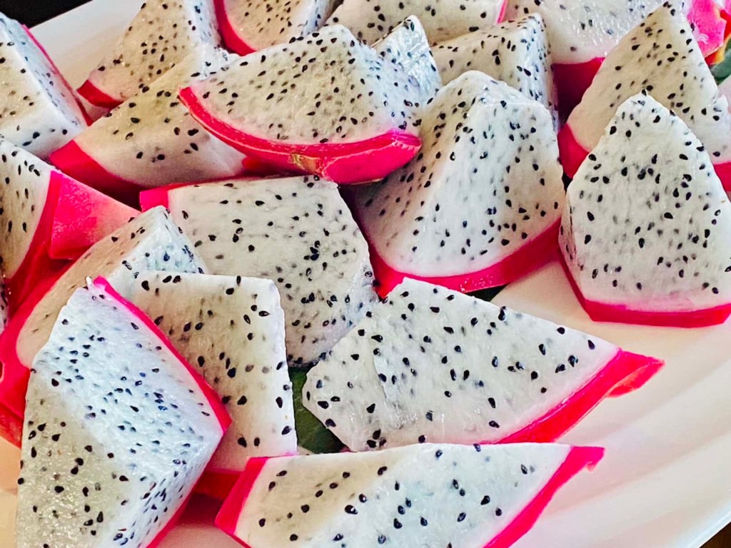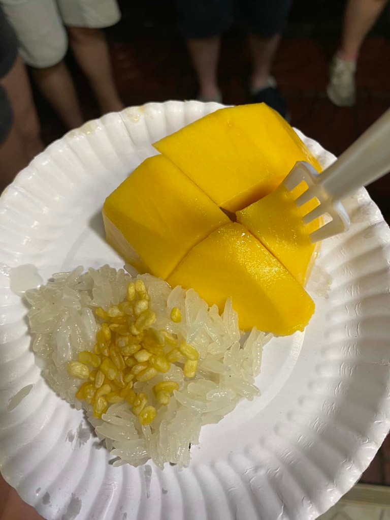The finish and all time favorite of every day: the Thai traditional dessert “Khao Niew Mamuang” (mango sticky rice). It’s soooo good and remains our absolute favorite dessert. This dish is made up of sticky glutinous rice doused in coconut milk and served with a side of sliced mango. Yum!!!
